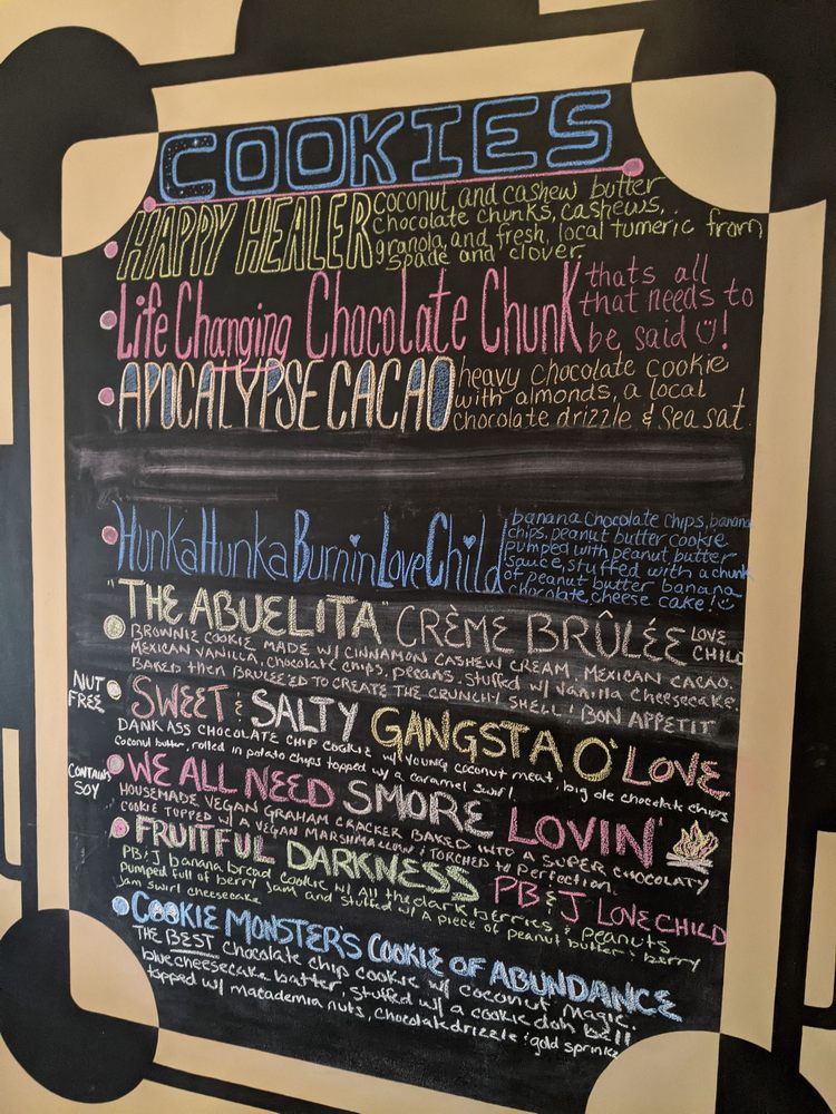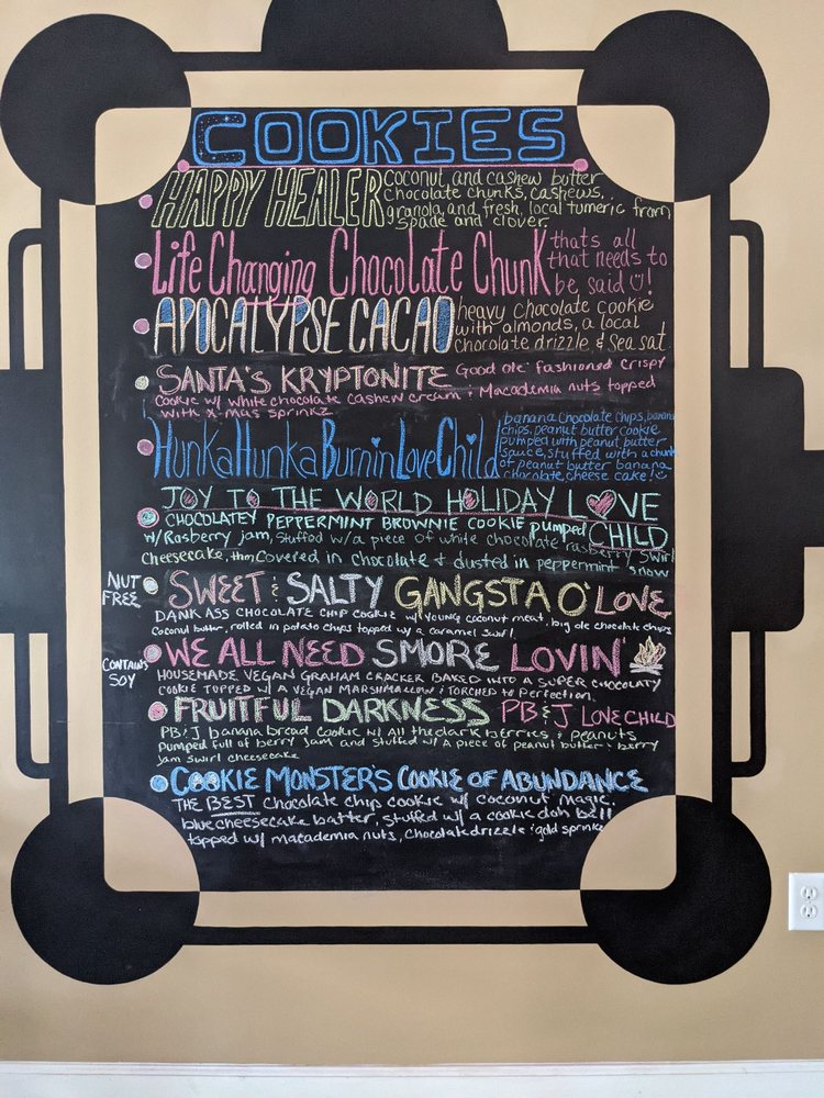 Bananas, peanut butter sauce, chocolate magic sauce, coconut magic sauce, and pressed with life changing chocolate chunk cookie pieces, served with blue chocolate cheesecake batter
