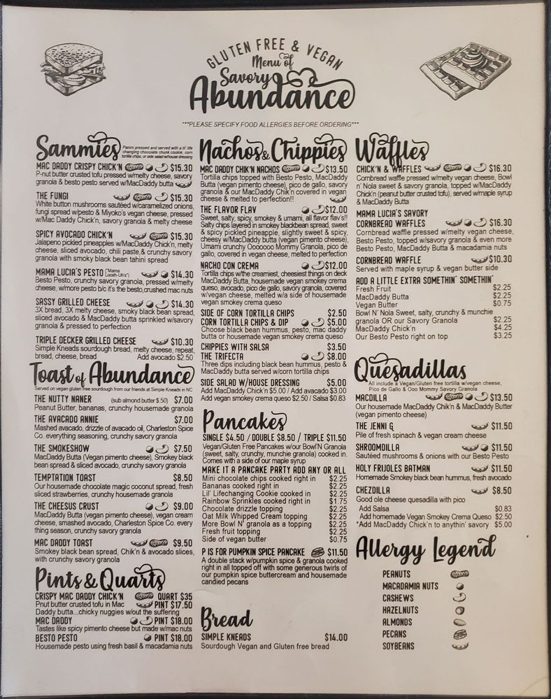 Local geechie-boy cornbread waffle pressed with melty vegan cheese, besto pesto, topped with savory granola, even more besto pesto, macdaddy butta, and macadamia nuts